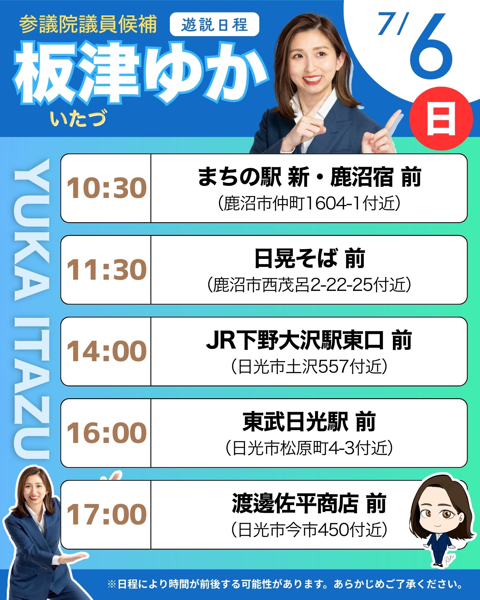 2025年7月7日 / 最終更新日 : 2025年7月8日 user3-admin 7月6日(日)街頭演説日程 【街頭演説会】10:30~10:45@まちの駅 新・鹿沼宿 【街頭演説会】11:30~11:45@日晃そば 【街頭演説会】14:00~14:15@JR下野大沢駅前 【街頭演説会】16:00~16:15@東武日光駅前 【街頭演説会】17:00~17:30@渡邊佐平商店前(日光市今市450)